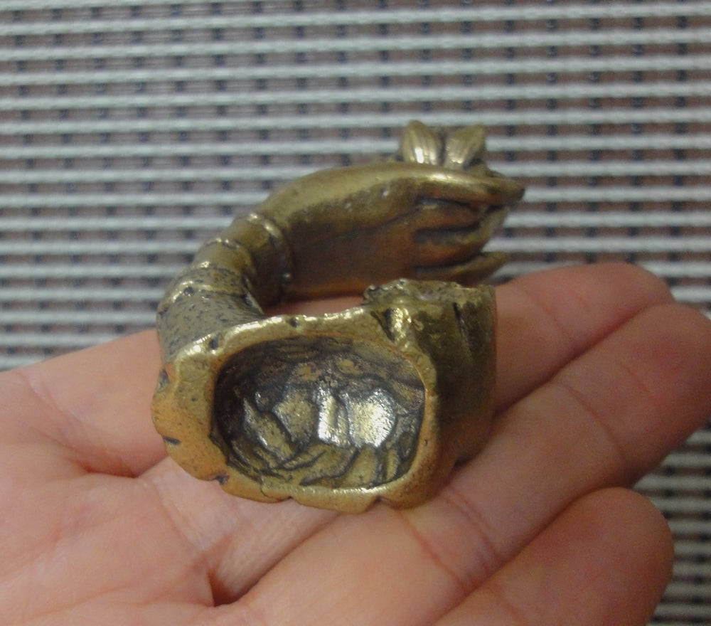 This is a brass Buddha hand lotus ornament—a delicate decorative piece featuring a lifelike hand (styled with bamboo-textured arm) holding a blooming lotus, finished with a classic golden brass patina. Perfect for adding a touch of tranquil, Eastern-inspired charm to desks, shelves, or meditation spaces.