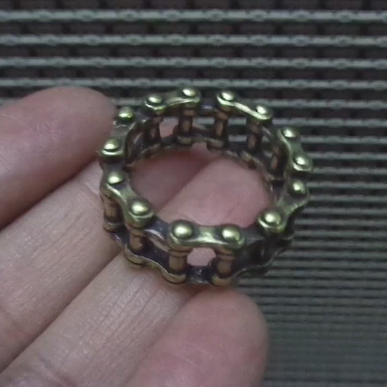 A solid brass ring with a vintage finish, featuring a bold, interlocking chain-link design that mimics the texture of industrial hardware. Its rugged, retro aesthetic makes it a striking accessory for those who favor edgy, timeless style.