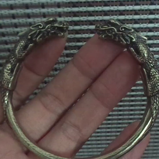 A vintage-style brass open cuff bracelet featuring intricately carved dragon heads at both ends. This bold design symbolizes power and good fortune in Chinese culture, with an adjustable fit for comfortable everyday wear.